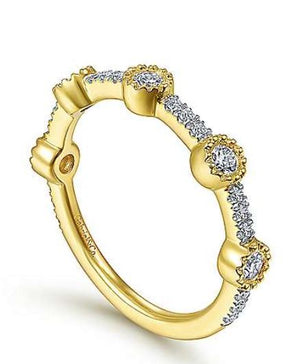 This Gabriel and Co 14kt Yellow gold Stackable Ring features 5 stations with a total of .033 ctw in diamonds. Perfect to wear alone or to include with any stack of rings.