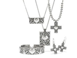 Iconic hearts and scrolls interplay beautifully in this high-contrast sculptural rectangular plaque bracelet.