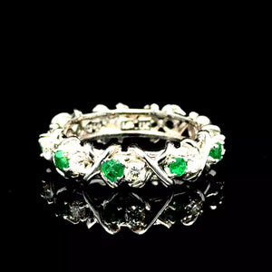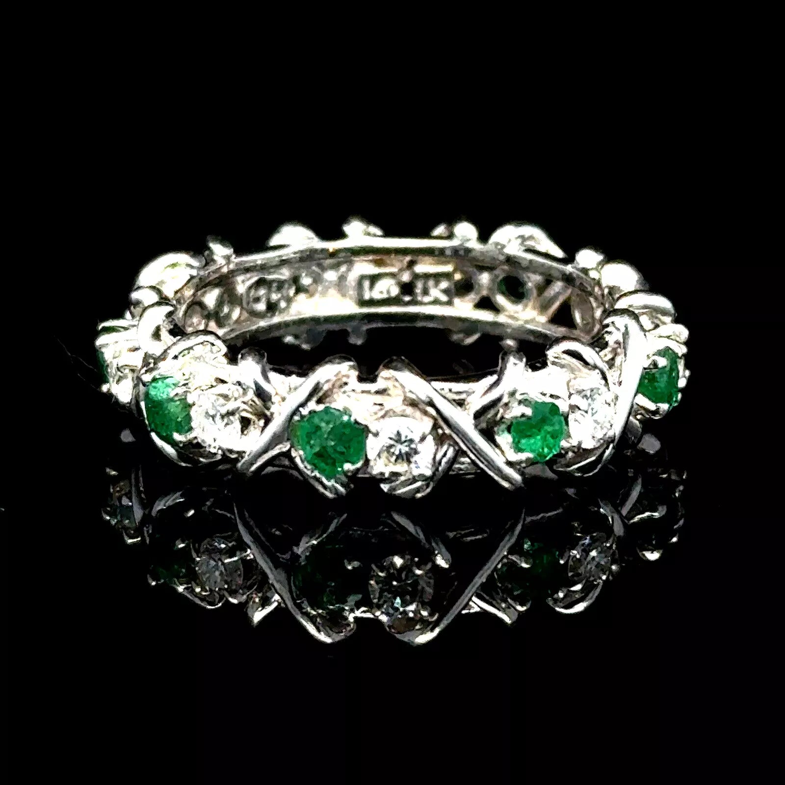 Inclusions in emeralds. See pictures before purchase. 4.7 grams total weight. This vintage Estate wedding band is a stunning piece of jewelry that will make any bride feel special on her big day. Crafted from 14k white gold, this ring features a beautiful emerald as the main stone with additional sparkling diamond accents. The band is .50ctw in total weight and is perfect for those who appreciate classic, timeless pieces. The Estate brand is known for their high-quality jewelry and this ring is no exception. It is an excellent choice for anyone looking for an elegant and sophisticated wedding band.