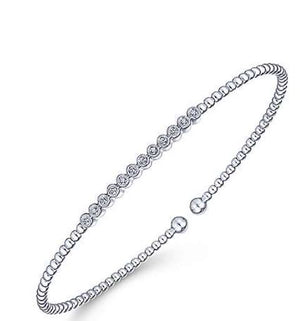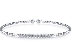 14Kt white gold Bujukan Bead Cuff Bracelet with 0.14 Bezel Set Diamond Stations. Crisp pave diamonds take center stage in this white gold bangle. From the Bujukan Collection. Perfect to wear alone or to wear as part of a stackable look.
