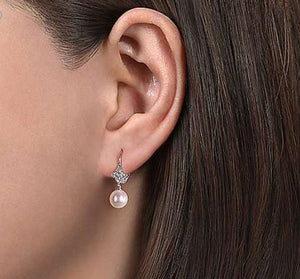 These elegant drop earrings each highlight a precious hanging cultured pearl. Floral clusters of diamonds totaling 0.09cts add a touch of feminine sparkle to the 14k white gold design. Perfect for wedding attire or any day you want to add a hint of femininity.