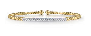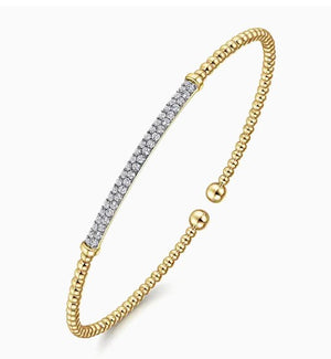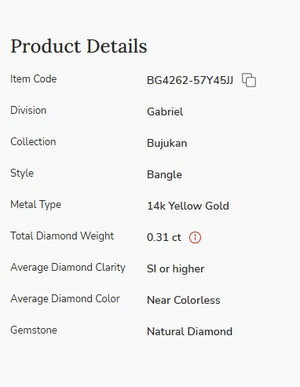 Welcome to our award winning Bujukkan bracelets from Gabriel and Co. We adore these bangle bracelets as they offer class, sophistication, silent and feather lite on your wrists, can wear alone or stack them to make the perfect arm party. All 14kt white gold, Gia graded mined natural diamonds, a unique serial number with a clean white diamond bar in the front. Size 5.75 fits petitte to normal size wrist.