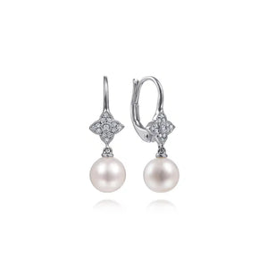 Elevate your elegance with the Lusso Drop Earrings from the Gabriel Collection. Each earring features a lustrous 7 mm natural pearl, gracefully suspended beneath a delicate cascade of near-colorless diamonds totaling 0.10 carats.