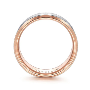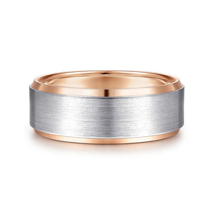 14K White-Rose Gold 8mm - Two Tone Beveled Edge Men's Wedding Band in Satin Finish