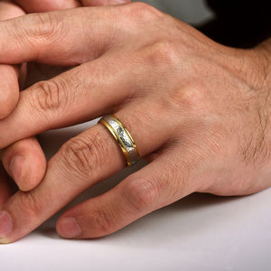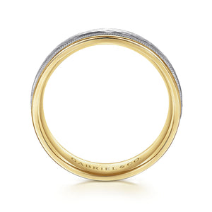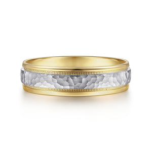 14K White-Yellow Gold 6mm - Two Tone Hammered Men's Wedding Band with Milgrain Edge