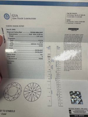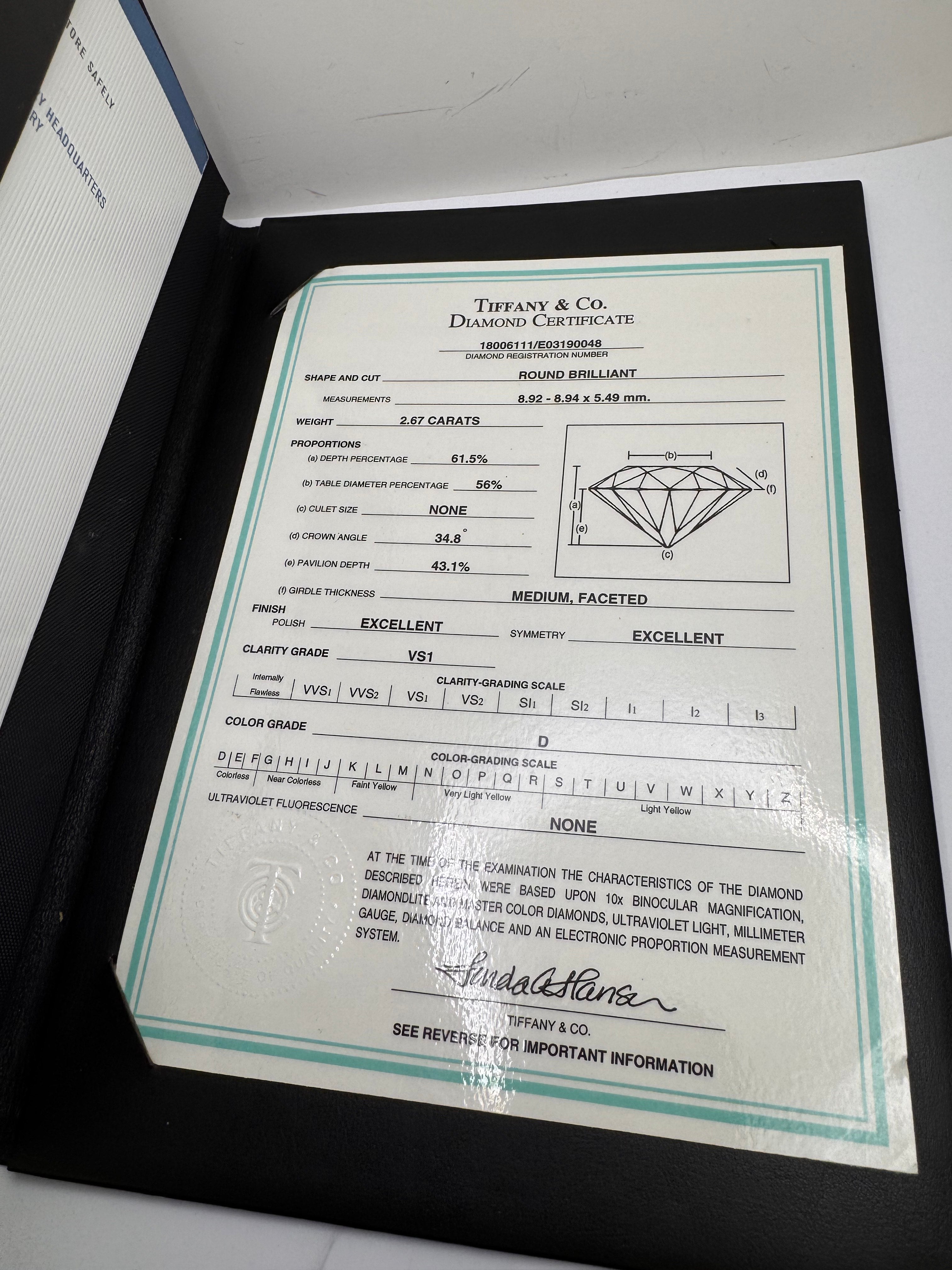 An extraordinary expression of timeless elegance, this authentic Tiffany & Co. diamond ring captures the very essence of luxury. At its heart rests a magnificent 2.67 carat round brilliant diamond, masterfully cut to unleash breathtaking fire and scintillation from every angle β¨