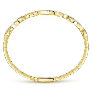 A twinkling bangle with sparkle to spare, this bangle from our Demure collection is sheer elegance. The foundation is made of segmented 14K yellow gold that shines with a chic and polished sheen. Adding a luxurious factor are twisting 0.63 ct diamonds that weave in and out in an interlacing motion. A fashionable statement bangle, combine this bangle style with many others for a glistening attribute to your daily accessorizing.