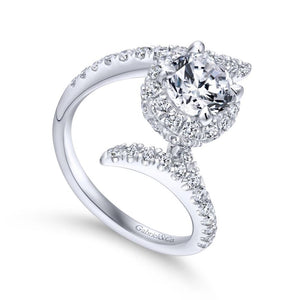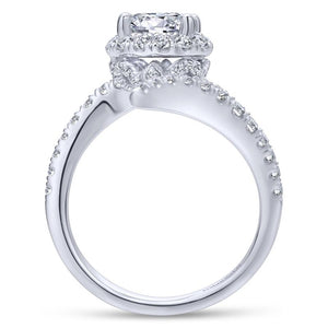 Introducing the Nebula collection from Gabriel Bridal's Nova line, where celestial beauty meets contemporary elegance. Crafted in luminous 14k white gold, this Halo-style ring is a radiant symbol of timeless sophistication. The crown type boasts a non-changeable setting, designed to accommodate stones up to 1 carat or 6.5 mm in size (center diamond not included). Adorned with a total diamond weight of 0.80 carats, the exquisite round diamonds exhibit superior quality, with G-H color and SI2 clarity or higher. With its captivating design and exceptional craftsmanship, the Nebula ring shines as a celestial tribute to love and style, perfect for the modern bride seeking celestial beauty. Call 516-279-6752 to have this ring specifically sized for you!