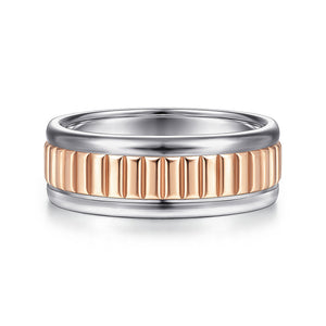 14K White-Rose Gold 8mm - Two Tone Carved Men's Wedding Band in High Polish Finish