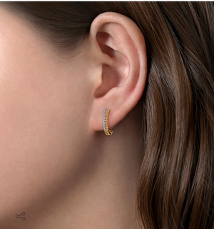 Parallel columns of shimmering pavé diamonds and beaded 14k yellow gold adorn these versatile huggie hoop earrings. Perfectly sized for everyday wear, they boast 0.10cts of shimmering diamonds in total.