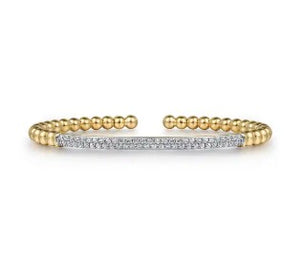 Made from rich 14K yellow gold, this bracelet showcases Gabriel’s signature Bujukan beading — a soft, textured embrace that wraps around the wrist like a gentle reminder of love. At the heart of the design, a sleek bar glimmers with 0.75 carats of pavé-set diamonds, capturing the light (and your heart) with every turn of the wrist.