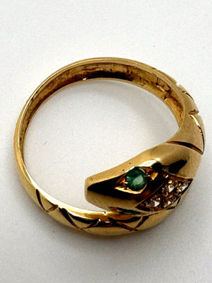 This exquisite 18k yellow gold snake ring is a true treasure for any jewelry lover. The ring features a stunning emerald and diamond design that is sure to catch the eye of anyone who sees it. With a size of 6.5, this ring is perfect for those who appreciate fine jewelry and want to add a touch of elegance to their collection.