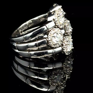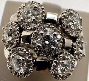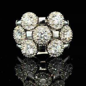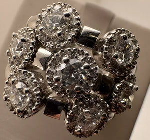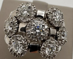 This beautiful ring from Sonia B. Designs features a stunning flower shape crafted from 14k white gold. The ring is adorned with sparkling diamonds, adding a touch of elegance to any outfit. The ring size is 5 and the total weight of the diamonds is 1.75ct. This piece is perfect for anyone who loves fine jewelry and wants to add a touch of glamour to their collection.