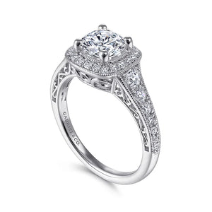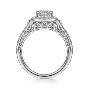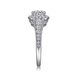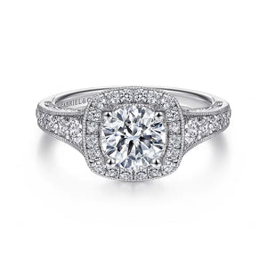 Introducing the Florence from Gabriel Bridal's Contemporary Division, a masterpiece in Victorian elegance. Crafted in lustrous 14k white gold, this halo-style ring exudes timeless charm with a modern twist. The Florence features a dazzling round center stone setting, perfect for a 1 carat gem, measuring 6.5 mm in diameter. Surrounding the center stone is a radiant halo of natural diamonds, totaling 0.55 carats in weight, showcasing exquisite clarity of SI2 or higher and a captivating G-H color. Crowned with a non-changeable head, tailored for stones ranging from 0.50 to 1.00 carats (center diamond not included), the Florence epitomizes sophistication and grace for the modern bride-to-be.