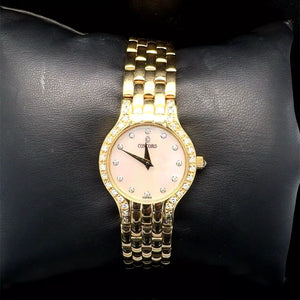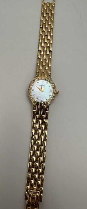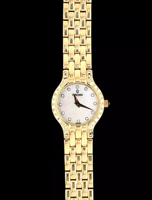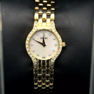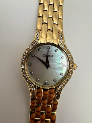 PERFECT GIFT 🎁 Elevate your style with this stunning Ladies Concord Les Palais wristwatch. Crafted with 14k solid yellow gold, this timepiece boasts a luxurious and timeless appeal. The diamond bezel and MOP dial add elegance to its already sophisticated design.