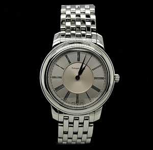 Tiffany & Co. has created functional elegance for pieces that are easy to wear every day. This stainless steel watch has a timeless and elegant look with a roman numeral dial while also being modern with it's round shape and water resistant. This is will be an everyday staple. Switzerland Movement: Quartz — Circa: 2000 Case Diameter: 37 Case Material: Stainless Steel Crystal Material: Sapphire Bracelet Length: 7.5" Excellent condition. Comes with new battery.