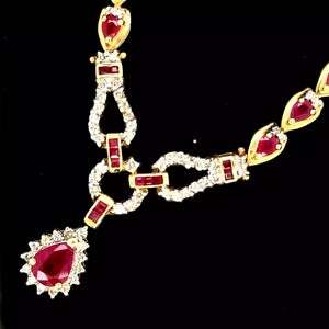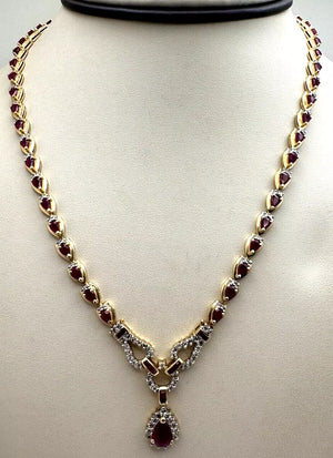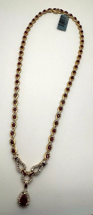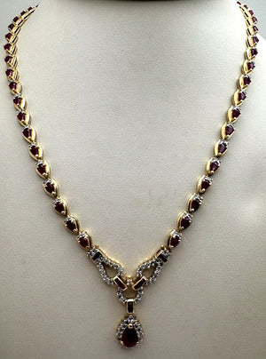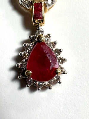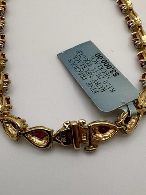 27 grams total weight. 1.15 ctw of diamonds. Bought in 1986 for 3000, has original tags. Add a touch of vintage elegance to your wardrobe with this stunning 14k yellow gold necklace. The necklace features a fine precious ruby stone and a toggle closure, making it a perfect addition to any jewelry collection. The chain style of the necklace adds a classic touch that will never go out of style. This necklace is perfect for any occasion and will make you stand out in any crowd.